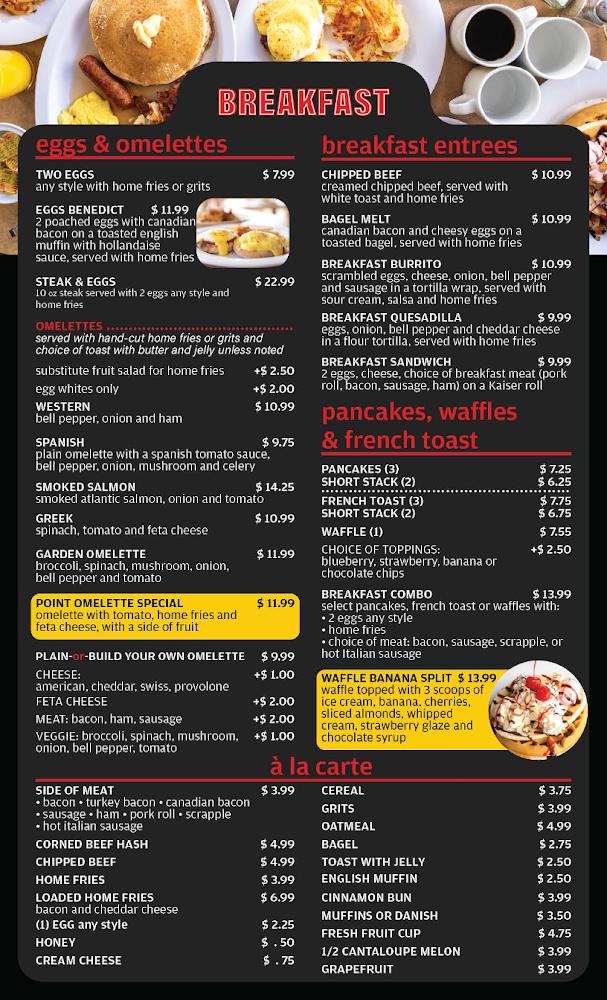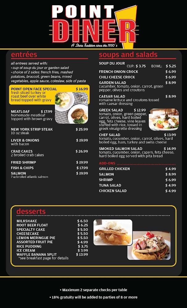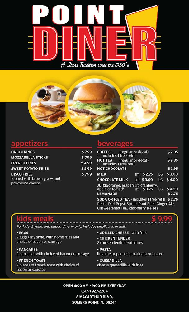 Welcome to Point Diner, your go-to spot for delicious, affordable meals in Somers Point, NJ. Enjoy our tempting $5 breakfast specials from Monday to Friday, served daily from 6 am to 11 am, and savor our Early Bird Specials from 3 pm to 6 pm. With a cozy ambiance and accessible facilities, we invite groups and solo diners alike to relish our excellent coffee, delightful desserts, and local specialties. Whether you’re dining in, taking out, or treating yourself to a late-night meal, Point Diner ensures a satisfying experience for everyone. Come visit us at 8 MacArthur Blvd!