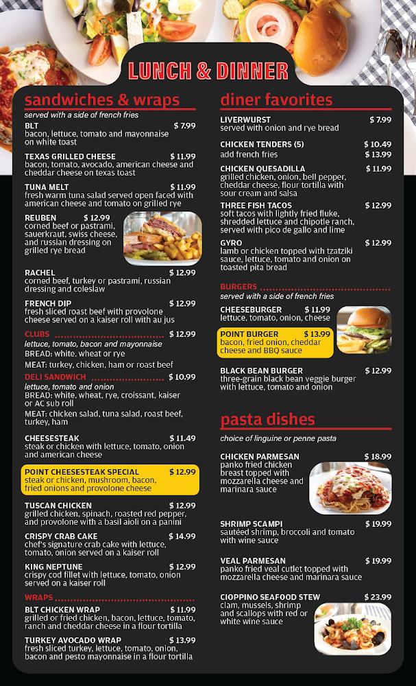 Point Diner boasts a simple yet extensive menu. Expect hearty American classics, comforting soups, and delicious sandwiches. Some favorites include the Point Sampler and the Reuben Sandwich, which satisfies well any hunger. Breakfast offerings span from classic omelets to warm pastries.